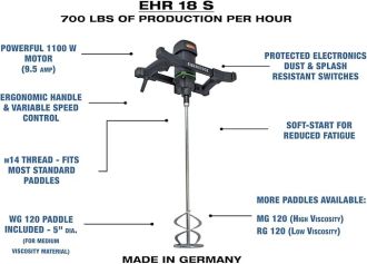 The CS Unitec EHR 18 S Portable Hand-Held Electric Concrete Mixer is designed for ease of use, featuring a simple on/off switch and a removable handle for portability. The folding handle allows for compact storage when not in use. The mixer’s relatively light weight (35 pounds) makes it easy to maneuver, even in tight spaces.